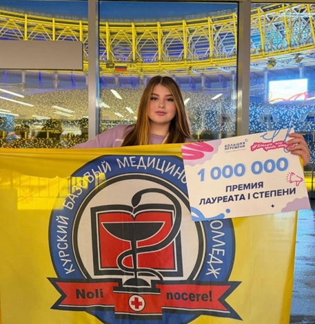 По итогам всех конкурсных испытаний студентка Курского базового медицинского колледжа Старикова Дарья признана лауреатом I степени и обладателем сертификата на 1 000 000 рублей.