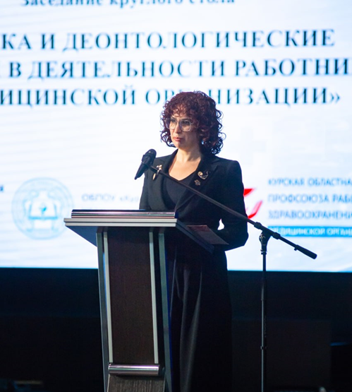 Отдельный вопрос на пленарном заседании был посвящён правовым аспектам деонтологии. Наталия Шеховцова, правовой инспектор труда ЦК Профсоюза по Курской области, обозначила, что соблюдение этических норм сегодня — это не только моральный императив, но и правовая обязанность, закреплённая в федеральном законодательстве. В своём выступлении она обобщила основные тенденции судебной практики по делам о защите чести и достоинства медицинских работников, роль профсоюза в правовом сопровождении членов организации, а также необходимость совершенствования локальных нормативных актов медицинских организаций.