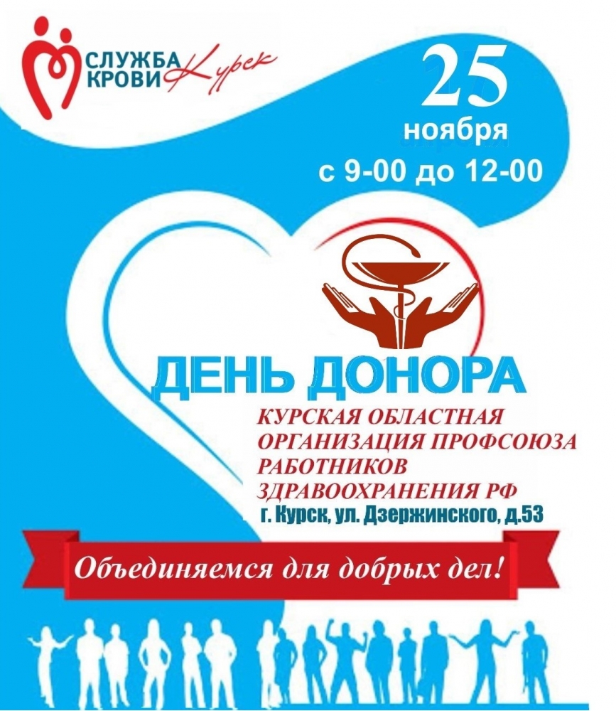 26 апреля 2024 года Курская областная организация профсоюза работников здравоохранения РФ совместно со службой крови города Курска проводит День Донора "Объединяемся для добрых дел"!