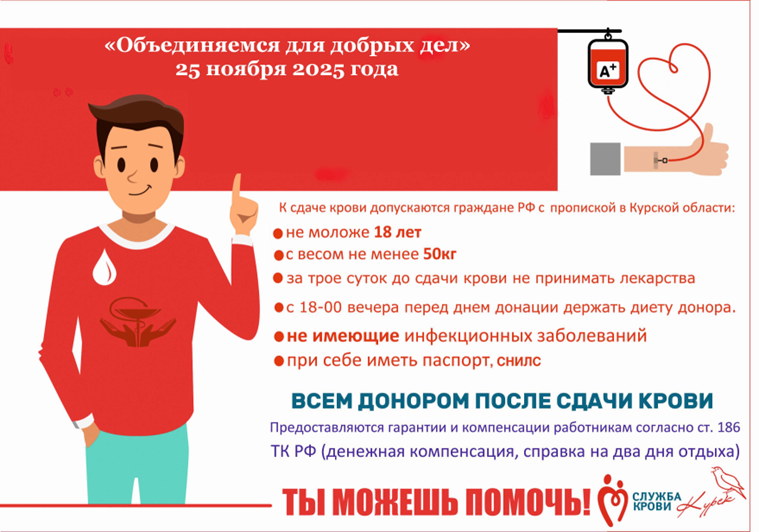 Уважаемые коллеги! Курская областная организация Профсоюза работников здравоохранения РФ в рамках проведения Дня Профсоюзов Курской области, приглашает профсоюзный актив медицинских организаций Курской области принять участие в донорской акции «Объединяемся для добрых дел», которая состоится 25 ноября 2025 года с 9-00 до 12-00 в актовом зале Дома профсоюзов.
