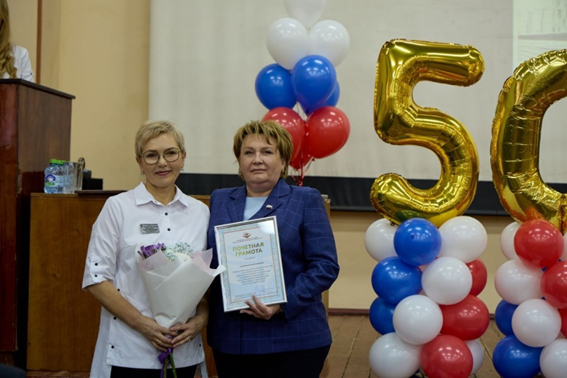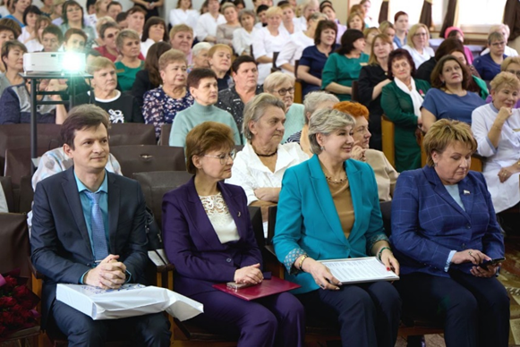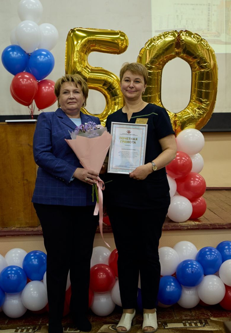 Председатель Курской областной организации Профсоюза работников здравоохранения РФ Светлана Охотникова вместе с заместителем Еленой Мирошник поздравили коллектив и профсоюзный актив со славным юбилеем, вручили профсоюзные награды.