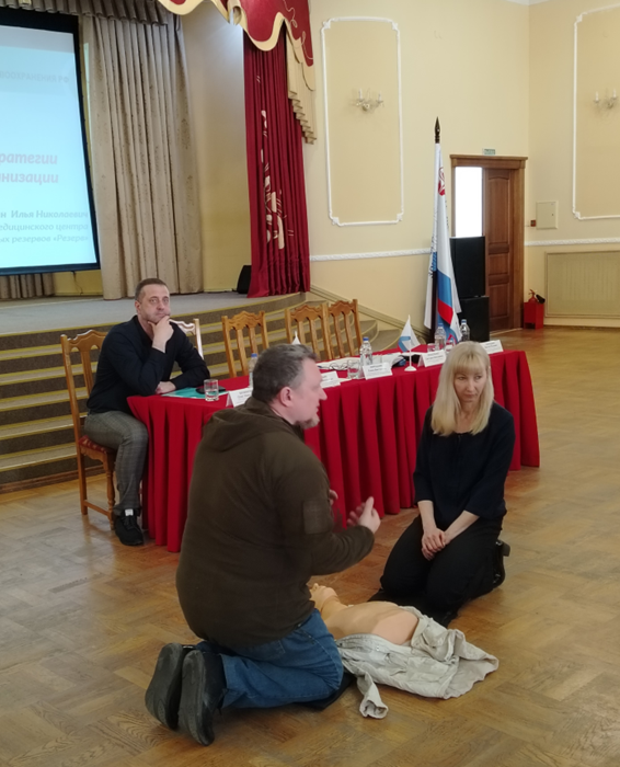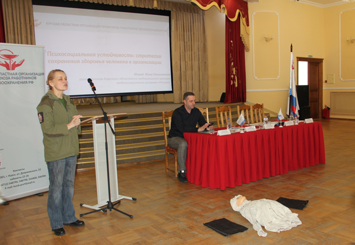 Руководитель Курского областного медицинского центра мобилизационных резервов «Резерв» Илья Ильин представил стратегии сохранения психосоциальной устойчивости работника в организации. В своём выступлении он остановился на отдельных профилактических мероприятиях, направленных на сохранение здоровья работников. Особенно интересным для всех стала информация о приемах оказания первой помощи пострадавшему. С участием аттестованного инструктора, самих слушателей, манекена – тренажёра разобран алгоритм действий, как быстро и правильно реагировать на угрозу жизни в первые минуты после происшествия, от которых во многом зависит сохранение жизни человека.