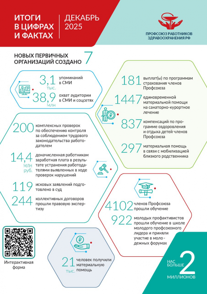 И вот лишь некоторые факты. Охват в средствах массовой информации достиг в последнем месяце года без малого 40 млн. Резонансный отклик в массмедиа получил Пленум ЦК Профсоюза и торжественная церемония награждения медработников в Зале Славы Музея Победы на Поклонной горе.